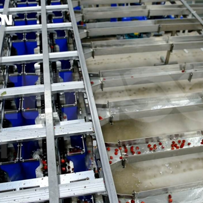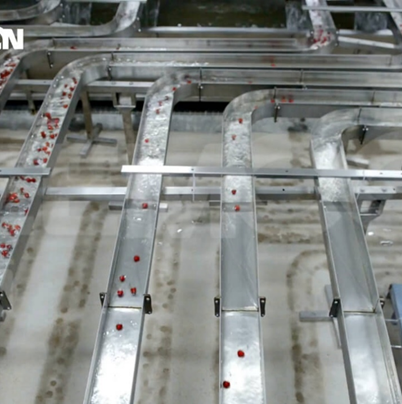 全不銹鋼水槽輸送完成分級(jí)的櫻桃,冷水輸送保證櫻桃處于冷環(huán)境下以維持櫻桃品質(zhì)的穩(wěn)定性,并且全程可視化,避免櫻桃因滯留而變味。