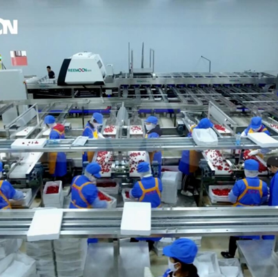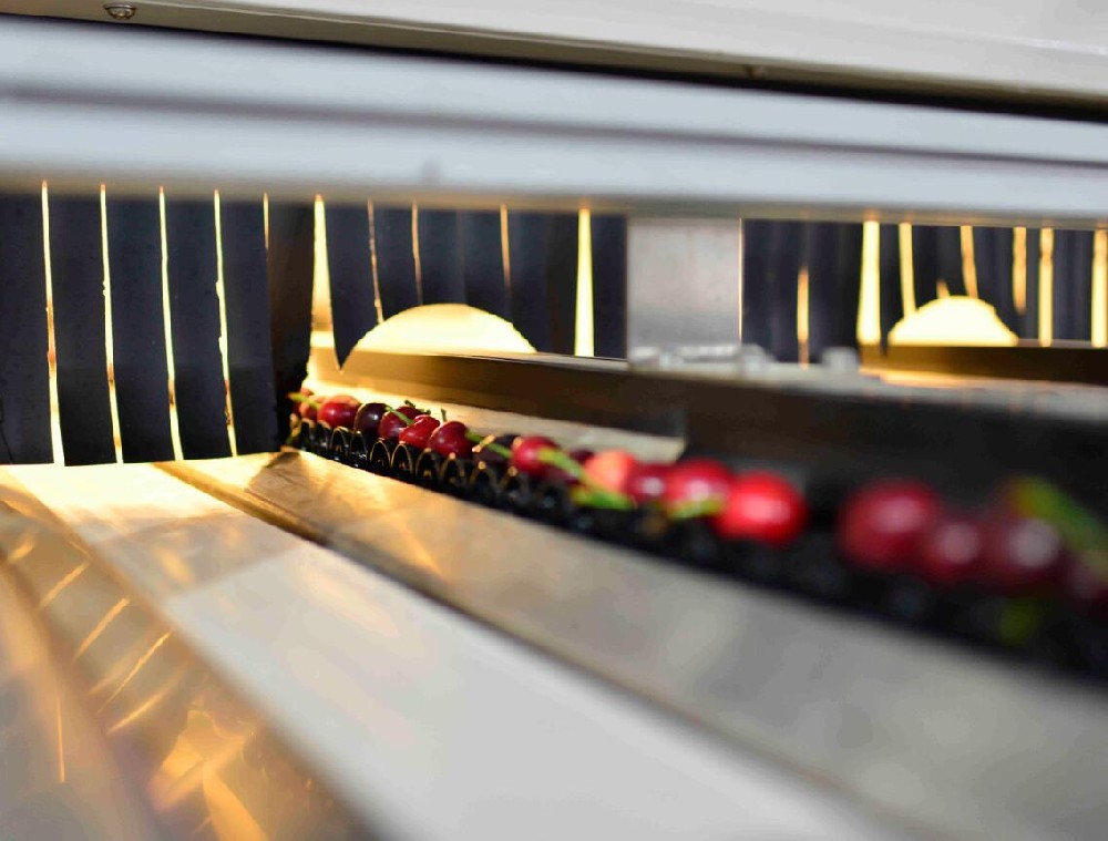 對(duì)櫻桃進(jìn)行再次漂洗,冷水循環(huán)系統(tǒng)讓櫻桃保持在低溫中分選,同時(shí)進(jìn)行階梯式預(yù)排列對(duì)櫻桃分兩次排列,提升上果率,提高分選效率。