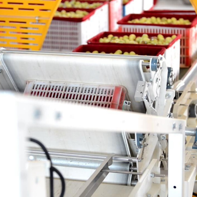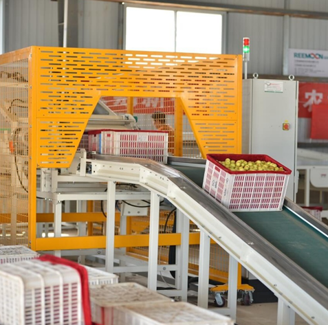 皮帶提升上料,將果筐放入皮帶,由皮帶自動輸送到翻箱環節。