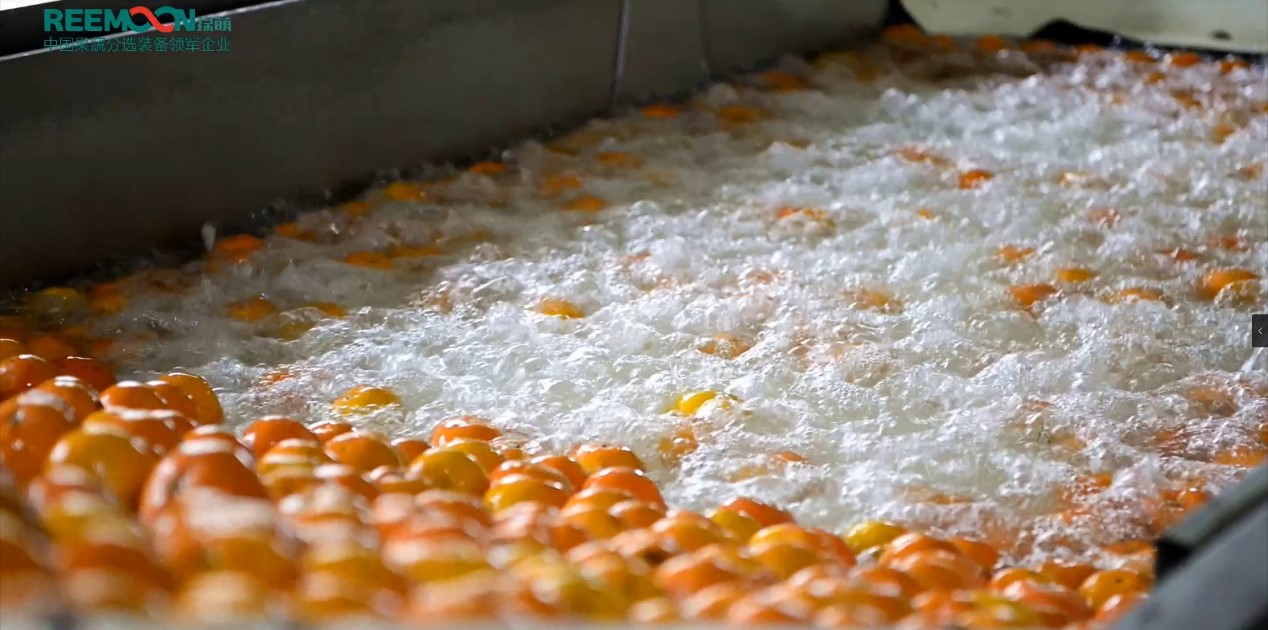 臍橙連續在水池內翻滾,利用水泡的沖擊力,讓臍橙得到浸潤,充分清洗掉臍橙表皮的附著物。