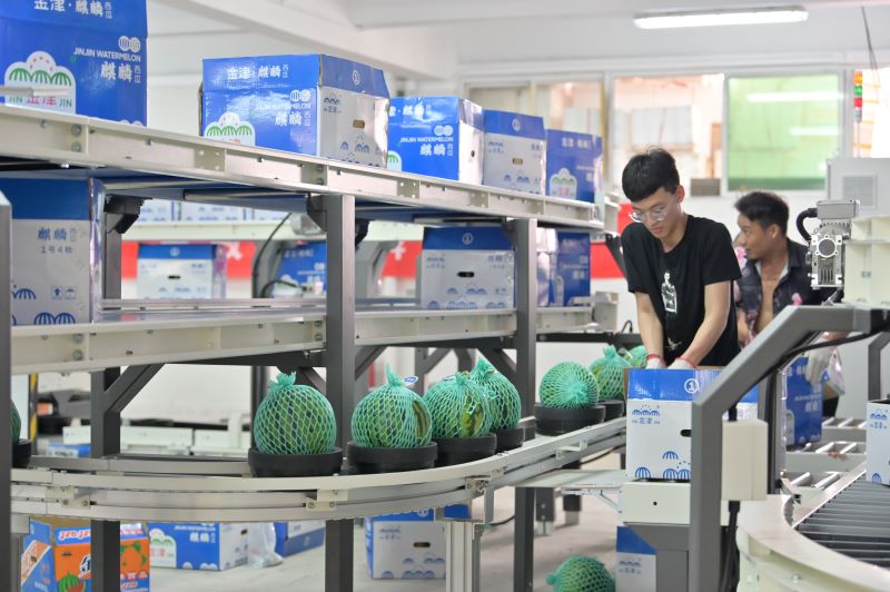 人工把西瓜放置在柔軟果杯中,從上料開始輕柔護果,避免西瓜受到磕碰。